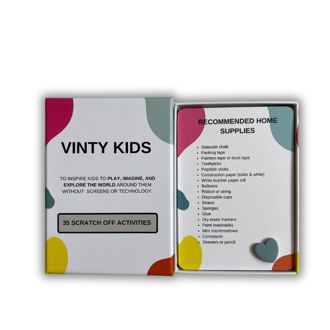 Many families have found that Vinty helps get kids off screens and back to the joys of real-world play. Just think of it, we all wanted to have fun and use our imagination when we were kids. They’re no different… they want to be engaged, but just need the right nudge. That’s where these scratch-off cards come in handy.